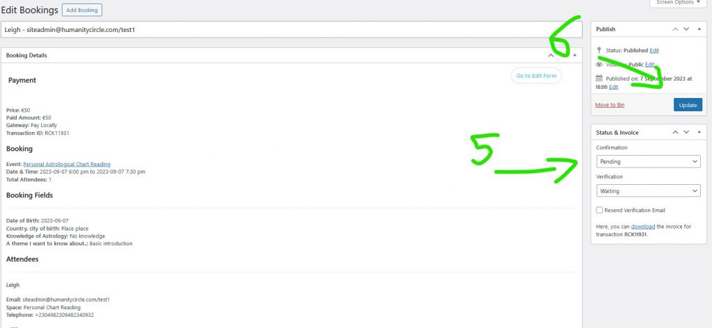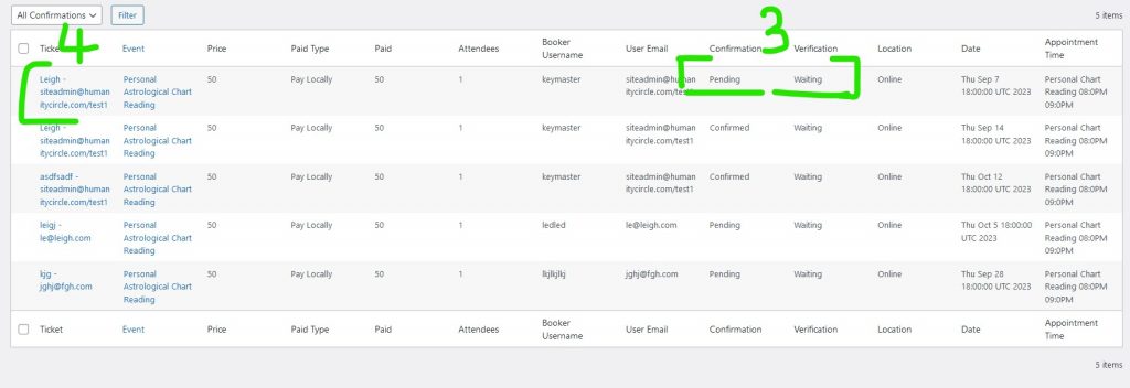 - Each booking tells you the status and if they are email verified.