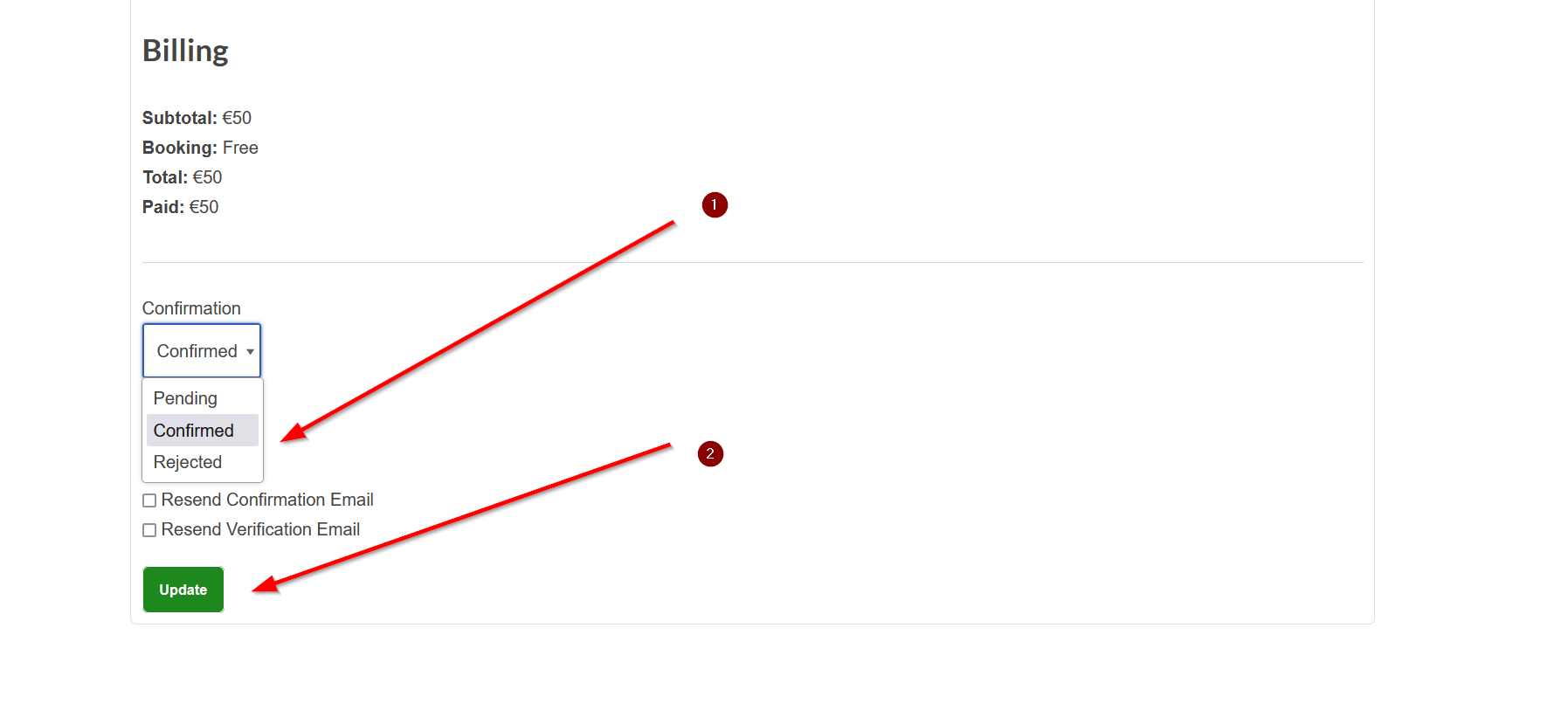 - When you wish to Confirm the booking, change the selection to Confirmed and select update.